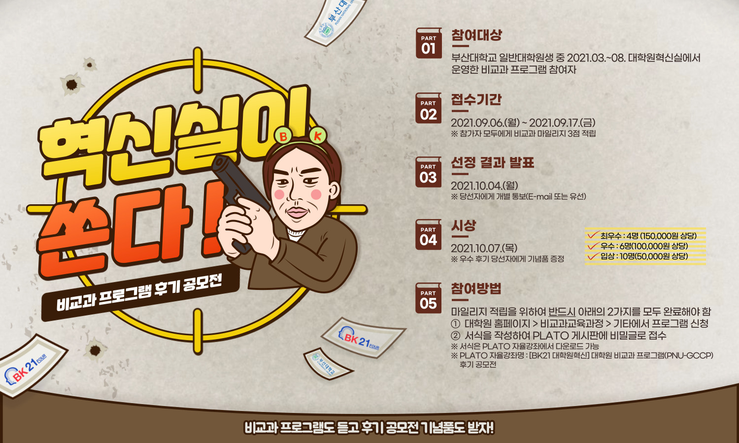 1. ‘2021년 상반기 대학원 비교과 프로그램(PNU-GCCP) 후기 공모전’을 아래와 같이 운영하오니, 학생들의 많은 관심 바랍니다.