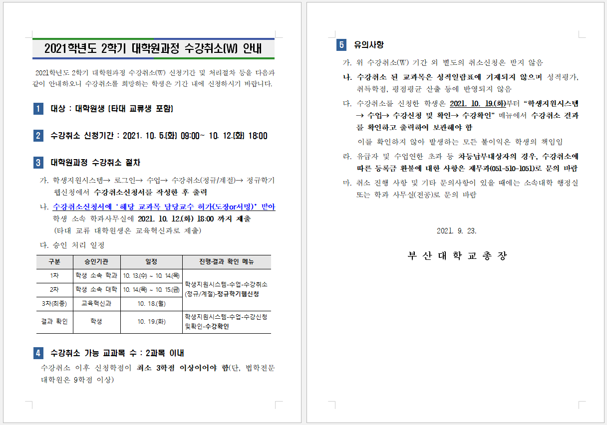2021학년도 2학기 대학원과정 수강취소(W) 안내