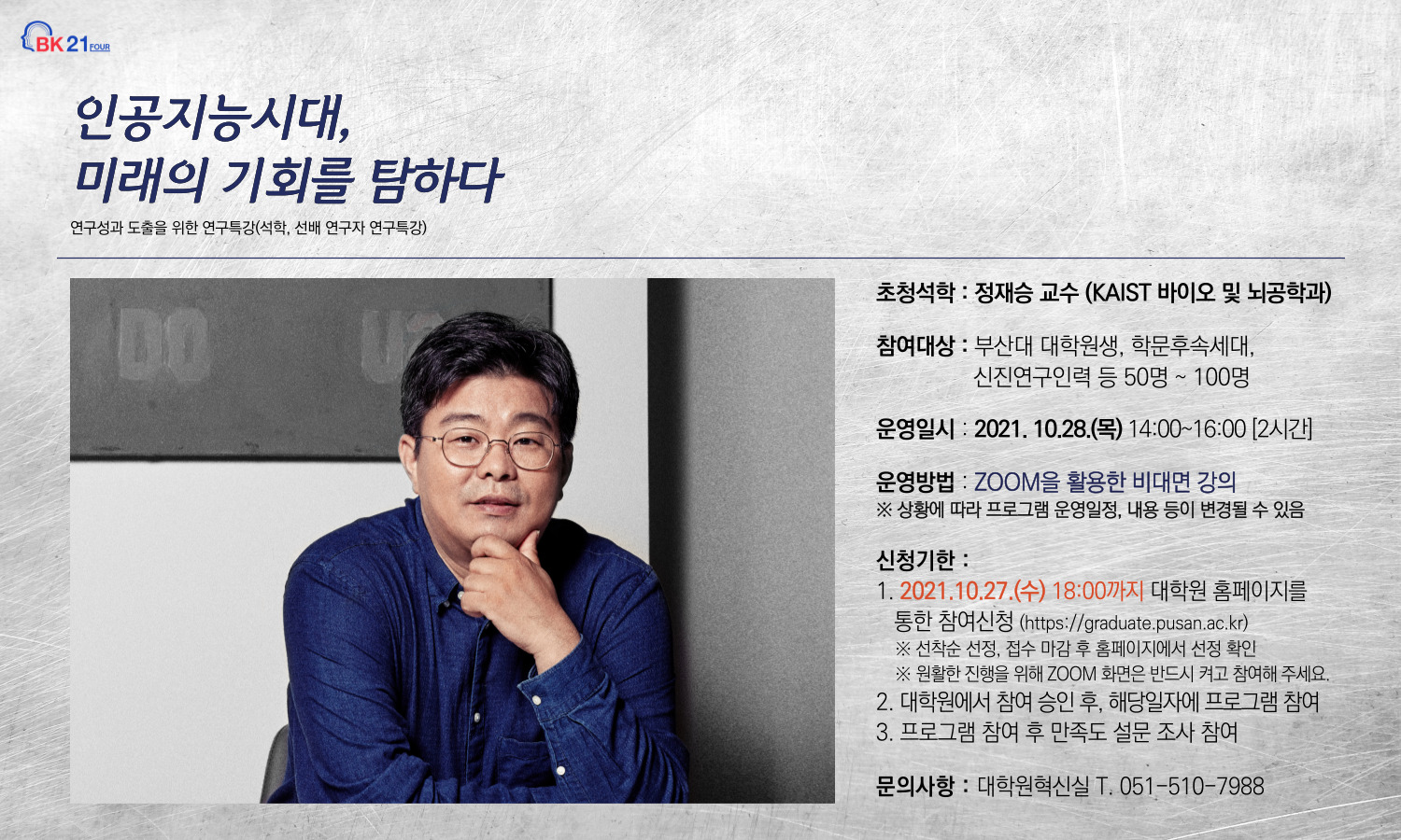 1. 「연구성과 도출을 위한 연구 특강: 석학, 선배 연구자 연구 특강」중 [석학초청 3차: 정재승 교수(KAIST 바이오 및 뇌공학과) 특강]을 다음과 같이 운영하오니, 많은 관심과 참여 바랍니다.