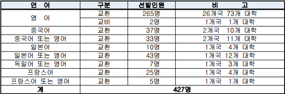 가. 선발 규모: 5개 언어, 28개 국, 19개 대학, 427명
