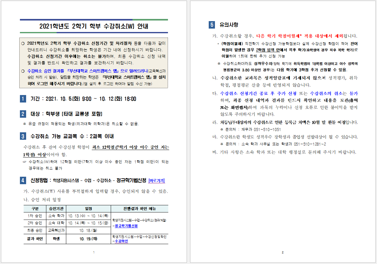 fnctId=bbs,fnctNo=12005 2021학년도 2학기 학부 수강취소(W) 안내 date 2021.09.27 name 성현경 e-mail view 104 첨부파일 1. 2021학년도 2학기 학부 수강취소(W) 안내문.hwp 미리보기 3. (학생) 정규학기 수강취소 사용자 설명서.hwp 미리보기